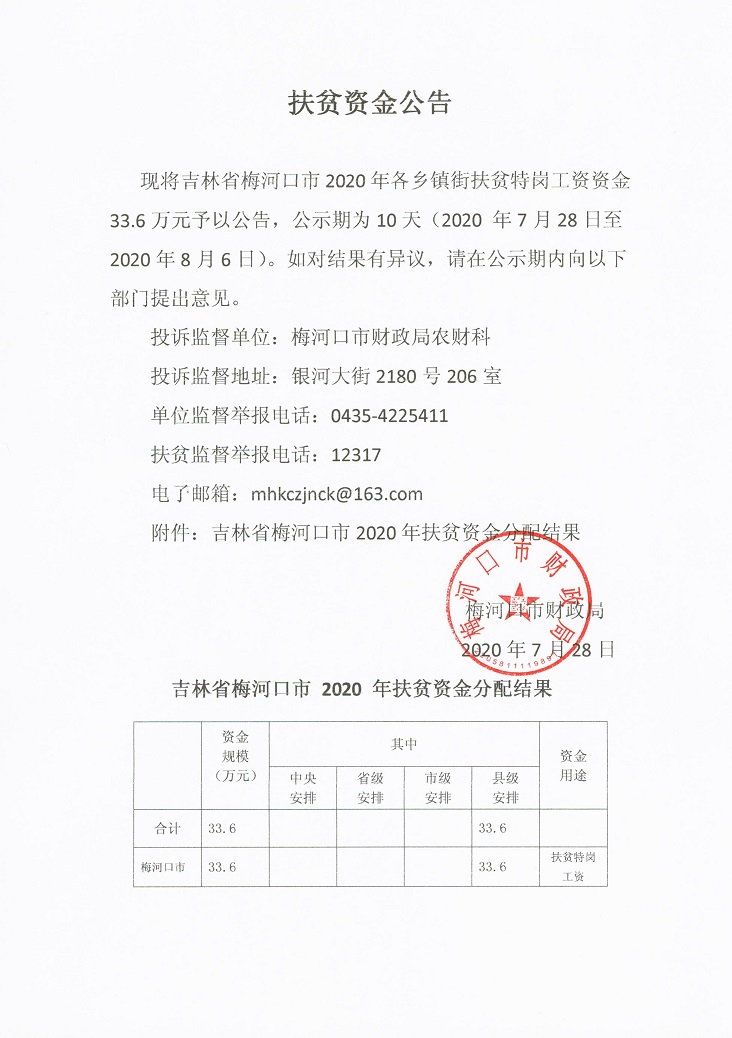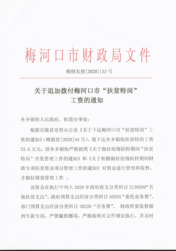 关于追加拨付梅河口市“扶贫特岗”工资的通知