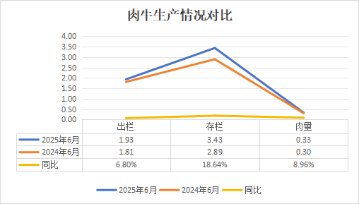 肉牛行情快速回暖。2025年上半年,我省牛肉均价64.51元/公斤,同比增长5%,二季度开始牛肉价格价格开始止跌回升。据监测,截至6月底,活牛价格为26.8元/公斤,同比下降1.47%,受进口牛肉价格影响,对国内市场形成持续冲击。如果今年下半年进口牛肉数量继续保持增长或处于高位,会增加国内牛肉市场的总供给。部分餐饮和加工企业可能会更多采用进口牛肉作为替代,间接导致对国产活牛的需求相对减少,压低活牛价格。