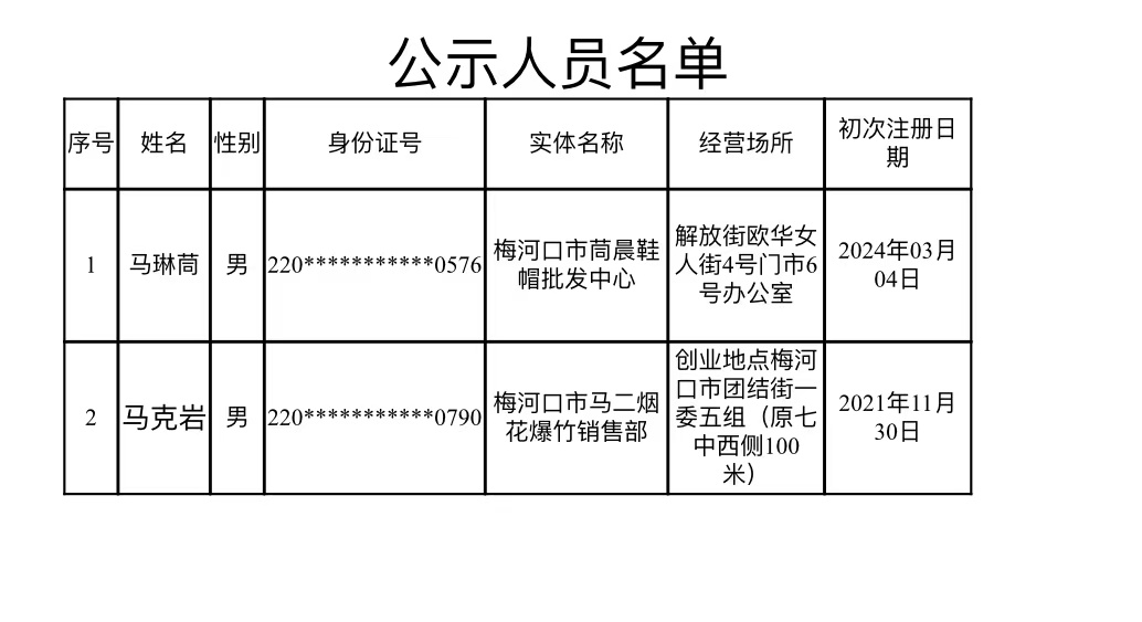 根据《关于做好初次创业补贴申请发放工作的通知》(吉人社联〔2020〕20号)文件要求,经本人申请,梅河口市就业服务局审核,拟认定下列人员符合申请条件,现公示如下。