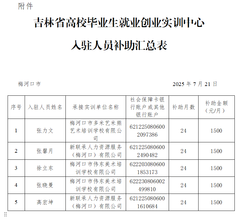 根据吉林省人力资源和社会保障厅、吉林省教育厅、吉林省财政厅关于印发《吉林省高校毕业生就业生活补贴实施细则(暂行)》等6项实施细则的通知(吉人社联〔2024〕78号)文件规定,我局对高校毕业生实训补助申请人员的材料进行审核、数据比对,拟对下列申请人员(详见附件列表)拨付补助,现予公示。