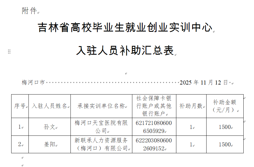 根据吉林省人力资源和社会保障厅、吉林省教育厅、吉林省财政厅关于印发《吉林省高校毕业生就业生活补贴实施细则(暂行)》等6项实施细则的通知(吉人社联〔2024〕78号)文件规定,我局对高校毕业生实训补助申请人员的材料进行审核、数据比对,拟对下列申请人员(详见附件列表)拨付补助,现予公示。