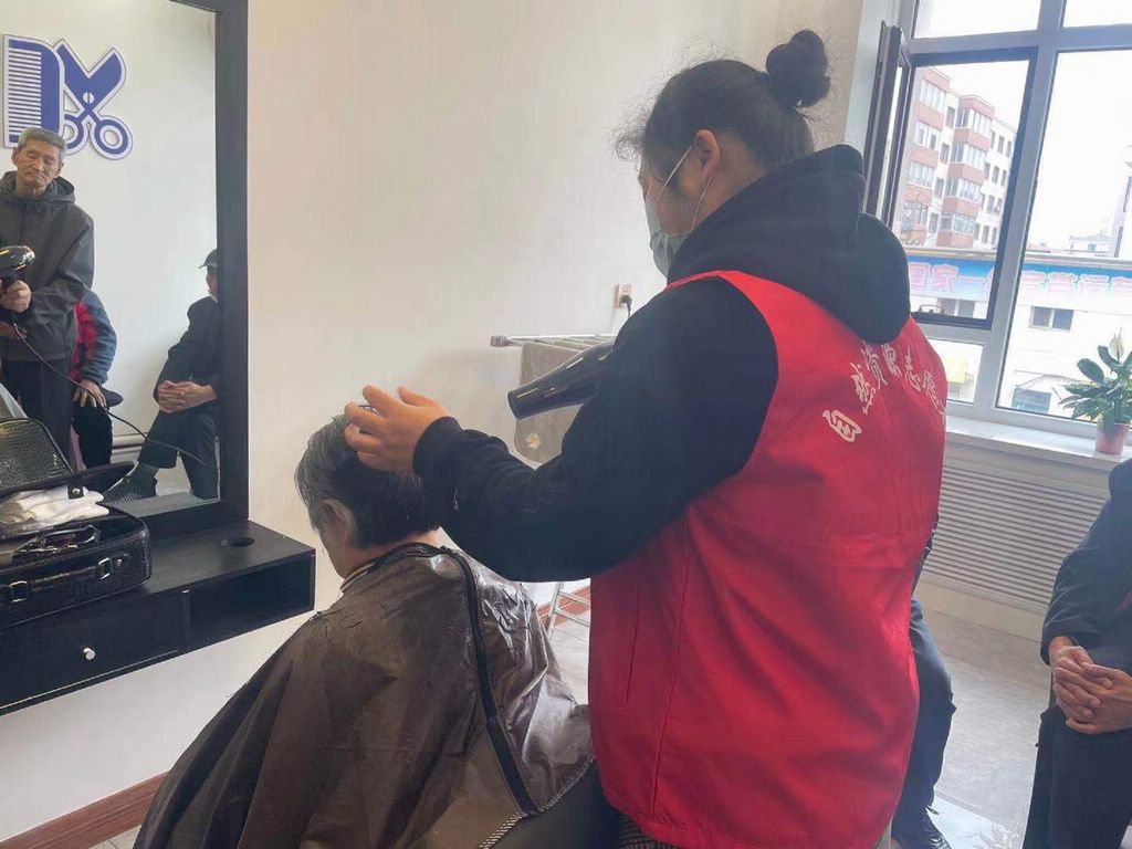 在站前党群服务站免费理发室,志愿者还充当起了“理发师助理”,为前来理发的老年人洗发、吹发。