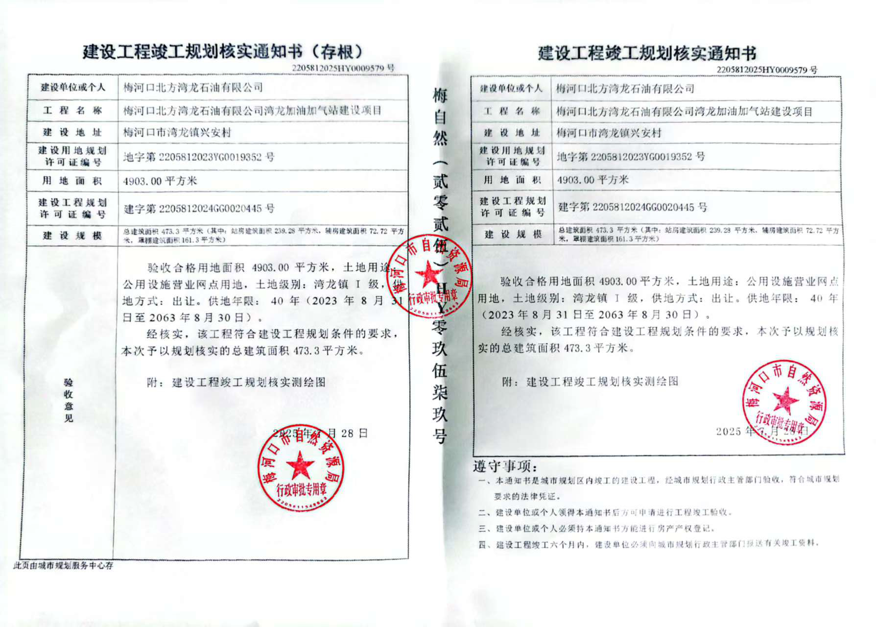 规划条件核实与土地核验合格证—梅河口北方湾龙石油有限公司湾龙加油加气站建设项目