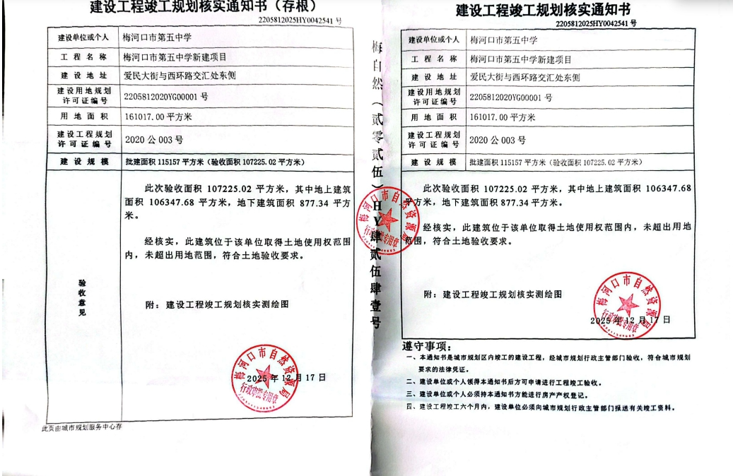 建设工程竣工规划核实通知书—梅河口市第五中学新建项目