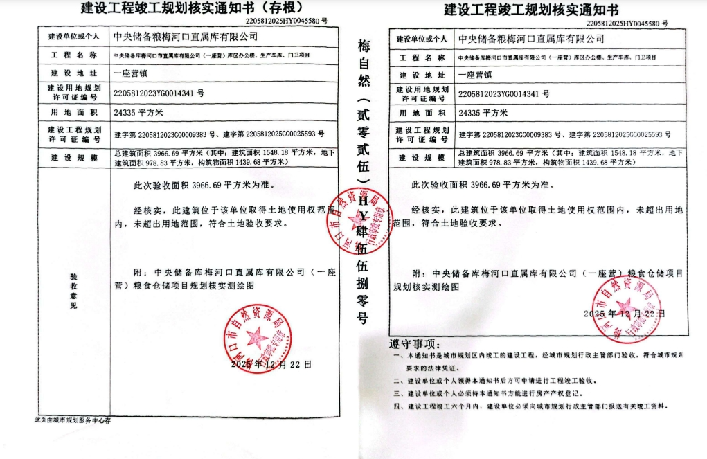 规划条件核实与土地核验合格证—中央储备库梅河口市直属库有限公司(一座营)库区办公楼、生产车库、门卫项目