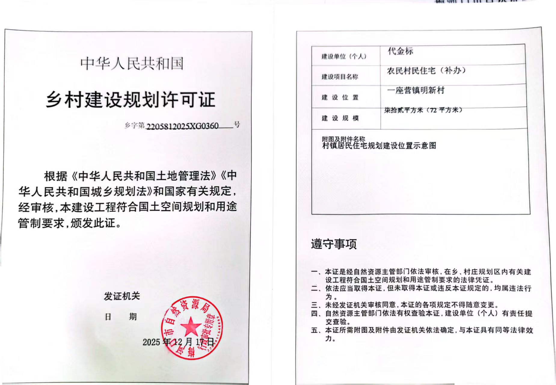 乡村建设用地规划许可证—代金标
