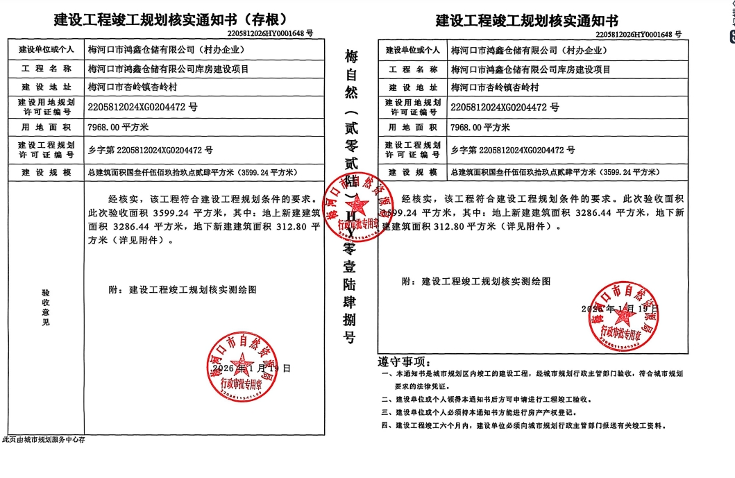 规划条件核实与土地核验合格证—梅河口市鸿鑫仓储有限公司库房建设项目