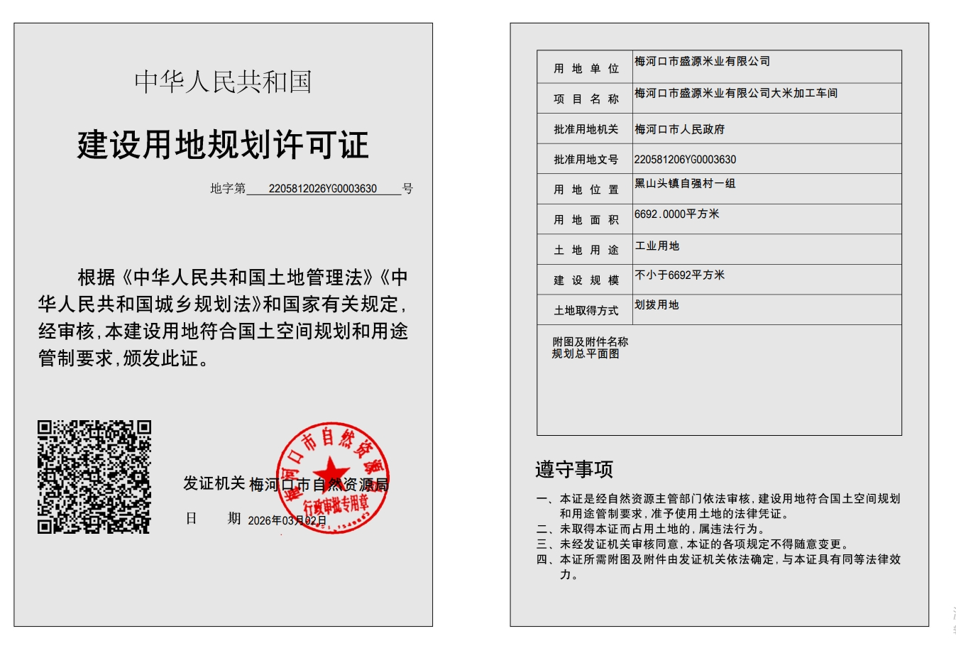 建设用地规划许可证—梅河口市盛源米业有限公司大米加工车间
