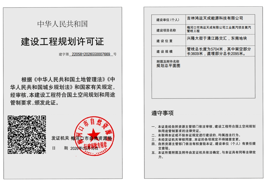 建设工程规划许可证 梅河口市鸿运天成有限公司工业蒸汽项目蒸汽管线工程