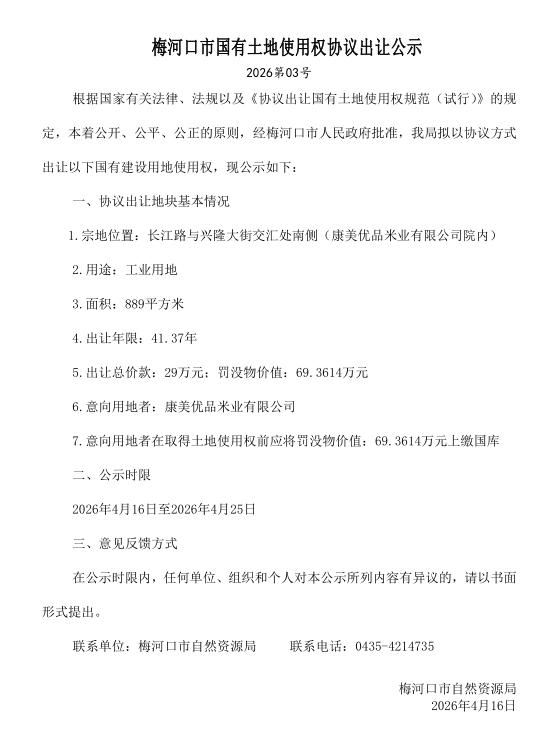 梅河口市国有土地使用权协议出让公示