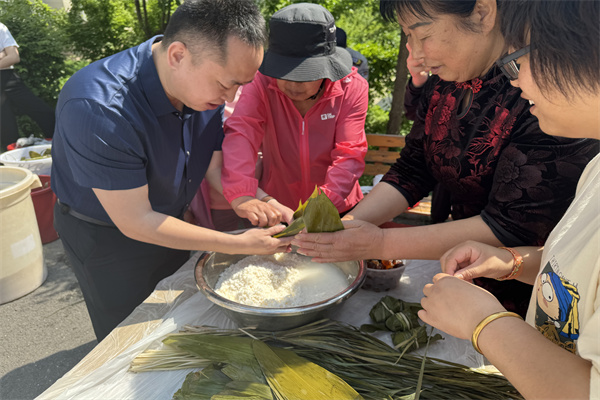 活动首先在小区内开展了包粽子环节,物业工作人员、社区工作人员和热心居民们组成了一支包粽子大军,大家忙而有序地系扎着青翠的粽叶、抓捻着香喷喷的粽子馅。一边动手一边交流着包粽子的经验,一边聊着生活中的各种趣事,气氛融洽热烈。