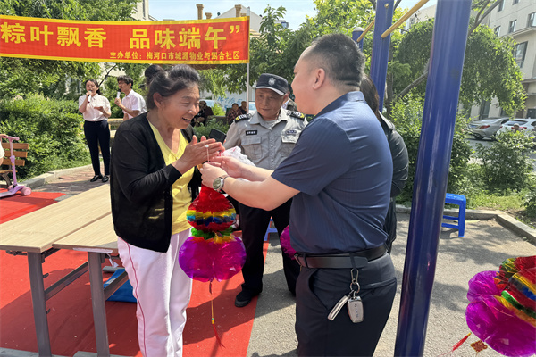 在煮粽子的间歇,社区和物业还贴心地安排了端午节知识有奖问答环节。社区和物业工作人员向居民们普及了端午节的来历、习俗,以及粽子的各种包法和吃法等知识,增进了大家对中华传统文化的认知和理解。现场气氛非常热烈,居民们踊跃举手回答,答对的居民工作人员高兴的领取葫芦、五彩绳等奖品。