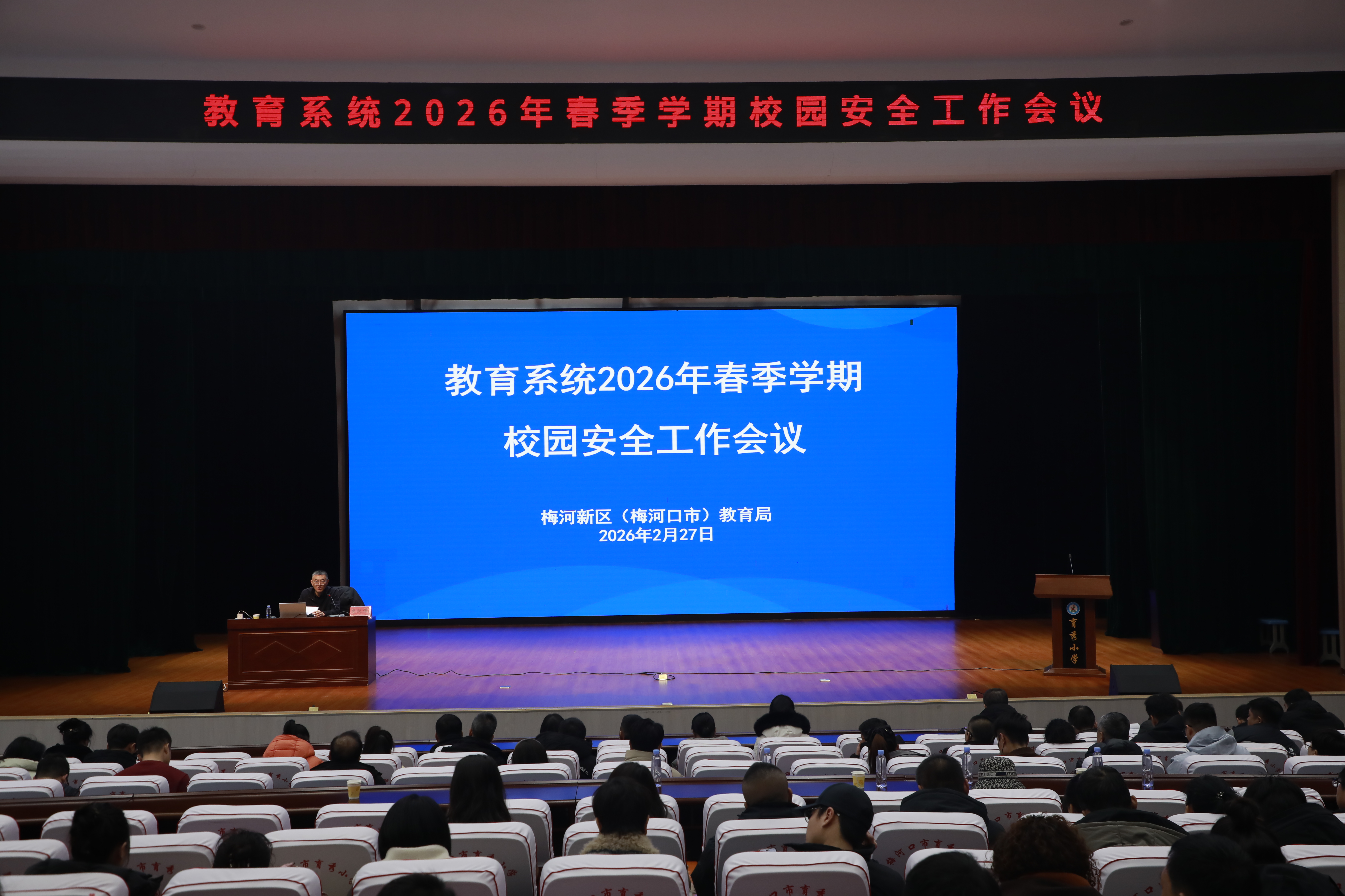 为进一步增强校园安全意识,提升校园安全管理水平,切实保障广大师生的生命财产安全,确保全市各级各类学校安全平稳有序开学,2月27日,梅河新区(梅河口市)教育局组织召开教育系统2026年春季学期校园安全工作会议,同步组织开展安全警示教育和专题培训。全市各中小学校、幼儿园安全副校长(副园长)、分管食堂副校长(副园长)、安全(保卫)科长、食品安全总监、食堂管理员,以及民办幼儿园园长,学科类校外培训机构负责人,共计300余人参加会议。