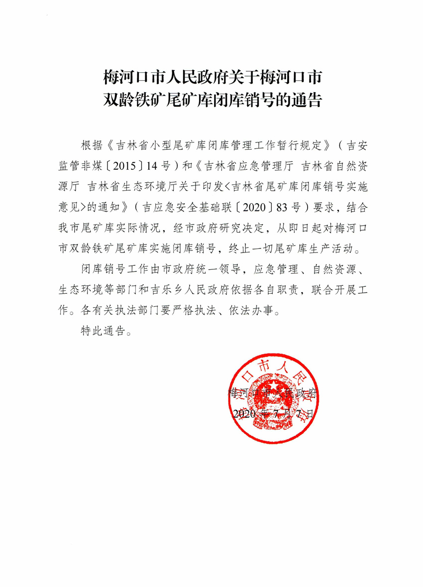 梅河口市人民政府关于梅河口市双龄铁矿尾矿库闭库销号的通告