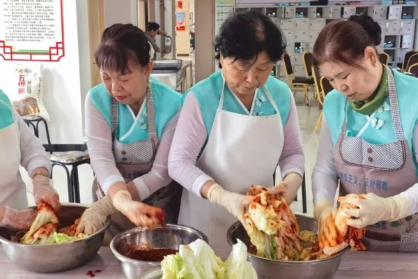 活动伊始,朝鲜族阿姨们早已备好新鲜的白菜、鲜红的辣椒面和秘制调料腌制传统辣白菜。“白菜要先腌出水分才够脆,调料要拌匀才够香”,阿姨们一边演示切菜、拌料的技巧,一边分享着自家的腌制秘方。各族邻里围在桌前在欢声笑语中默契配合。不一会儿,一盆盆色泽鲜亮的辣白菜便腌制完成,酸辣的香气弥漫开来,也将彼此的距离拉得更近。