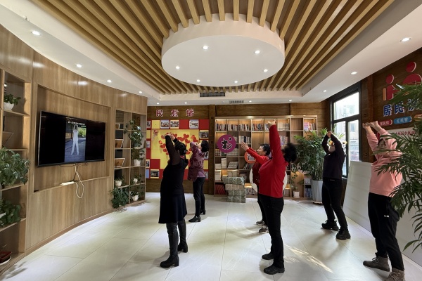 随着悠扬舒缓的传统乐声在服务站内响起,居民们跟随八段锦教学视频,纷纷起身,凝神静气,学习这套流传千年的养生功法。起初,一些居民的动作还略显生疏僵硬,但在轻柔的音乐中,大家逐渐放松下来,动作也变得流畅自然。一招一式,舒展大方;一呼一吸,深长匀缓。不一会儿,不少人的身上便开始微微发热,脸上也露出了舒畅愉悦的笑容。
