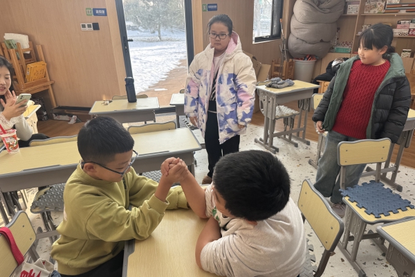 男孩子们还展开了一场激烈的掰手腕比赛,他们鼓足力气,力争上游,展现出青春活力与拼搏精神。游戏后,孩子们一边品尝着美味的糖葫芦,一边围坐在一起开心地聊天,分享着彼此的快乐与新年愿望。