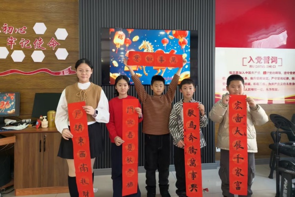 红纸铺展,墨香四溢。“骏马奔腾万事兴,宏图大展千家富”“户纳东西南北财,门迎春夏秋冬福”……一幅幅寓意吉祥、对仗工整的春联在孩子们笔下渐渐成形,一个个饱满喜庆的“福”字跃然纸上。虽然笔触稚嫩,却满含童真与诚意,每一幅作品都承载着对新年的美好期盼,对家人、邻里的真挚祝福。