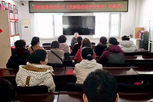 为深入学习宣传《中华人民共和国民族团结进步促进法》,进一步铸牢中华民族共同体意识,营造各民族居民和睦相处、和谐发展的良好氛围。3月18日,福民街道桥西社区组织辖区各族居民开展《中华人民共和国民族团结进步促进法》专题学习活动。