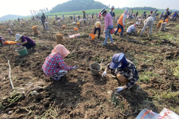 7月之际,土豆迎来了收获季,镇村两级组织千余人开展土豆收割。田间一片金黄,一垄垄马铃薯正在被翻出,随处可见工人们劳作的忙碌身影。收割采取“机器+人工”的方式,每亩产值达6000斤,日均收割五万斤。田间地头,所到之处,皆是圆滚滚、黄澄澄的马铃薯。