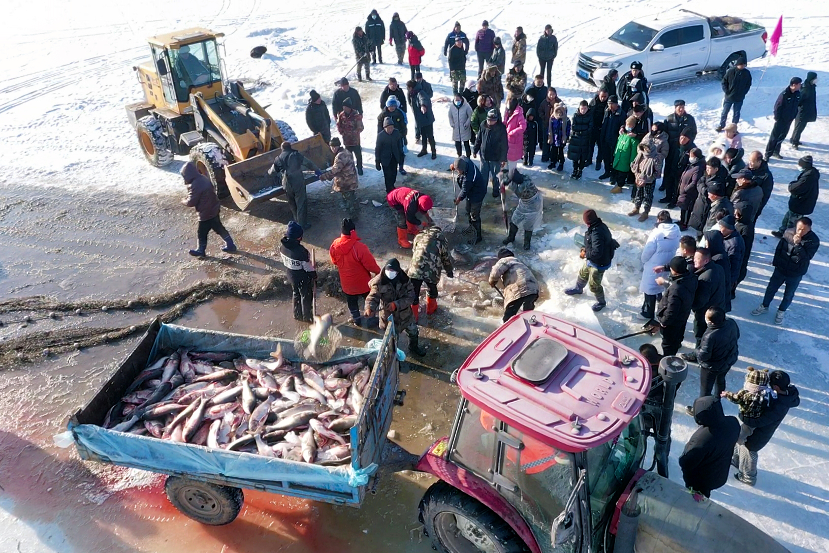 冬捕的序幕随着清晨洒在冰面上的第一缕阳光缓缓拉开。渔网渐渐浮出水面,活蹦乱跳的鱼儿如银龙般跃出冰面,在阳光的映照下闪烁着粼粼波光,这是大自然对勤劳人们慷慨的馈赠。经验丰富的渔工们,分工有序进行着捕捞大鱼、清除碎冰的各项操作,肥硕的鲜鱼铺满冰面、装入卡车,现场热闹非凡。