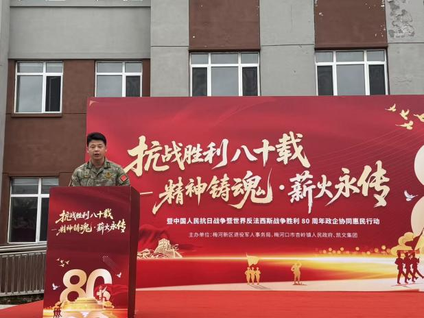 八十年风雨兼程,八十年山河无恙。为铭记历史、缅怀先烈、致敬英雄,赓续红色血脉,凝聚奋进力量,由梅河新区退役军人事务局、杏岭镇人民政府、凯文集团联合主办的“抗战胜利八十载——精神铸魂·薪火永传”主题纪念活动暨中国人民抗日战争暨世界反法西斯战争胜利80周年政企协同惠民行动在杏岭镇隆重举行。活动在气势恢宏、情感真挚的开场舞《万疆》中拉开序幕。舞姿间流淌的家国情怀,每一句歌词都唱响了对民族复兴的期盼,瞬间点燃了现场庄重而热烈的氛围,将大家的思绪带回到那个同仇敌忾、共御外侮的年代。