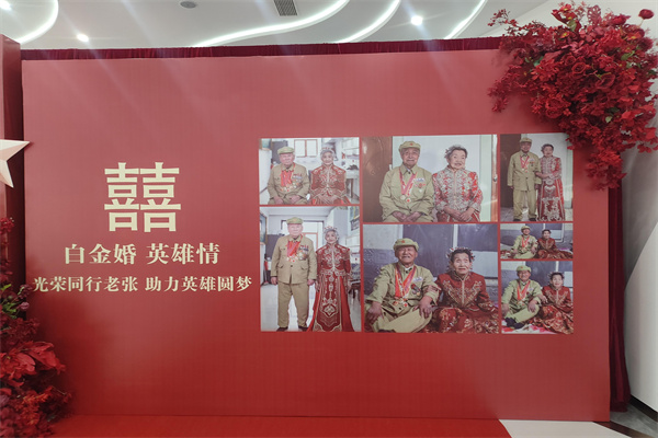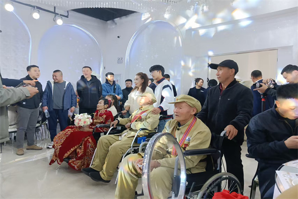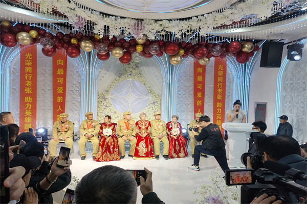 在梅河口市嗣福喜宴婚礼艺术中心,三对功勋老兵夫妇身着喜庆中式礼服,在激昂的《中国人民志愿军战歌》中,挽着相伴一生的爱人缓步走过鲜花装饰的“幸福之门”。他们的步伐虽已蹒跚,但紧握的双手和幸福笑容感染了现场每一个人。