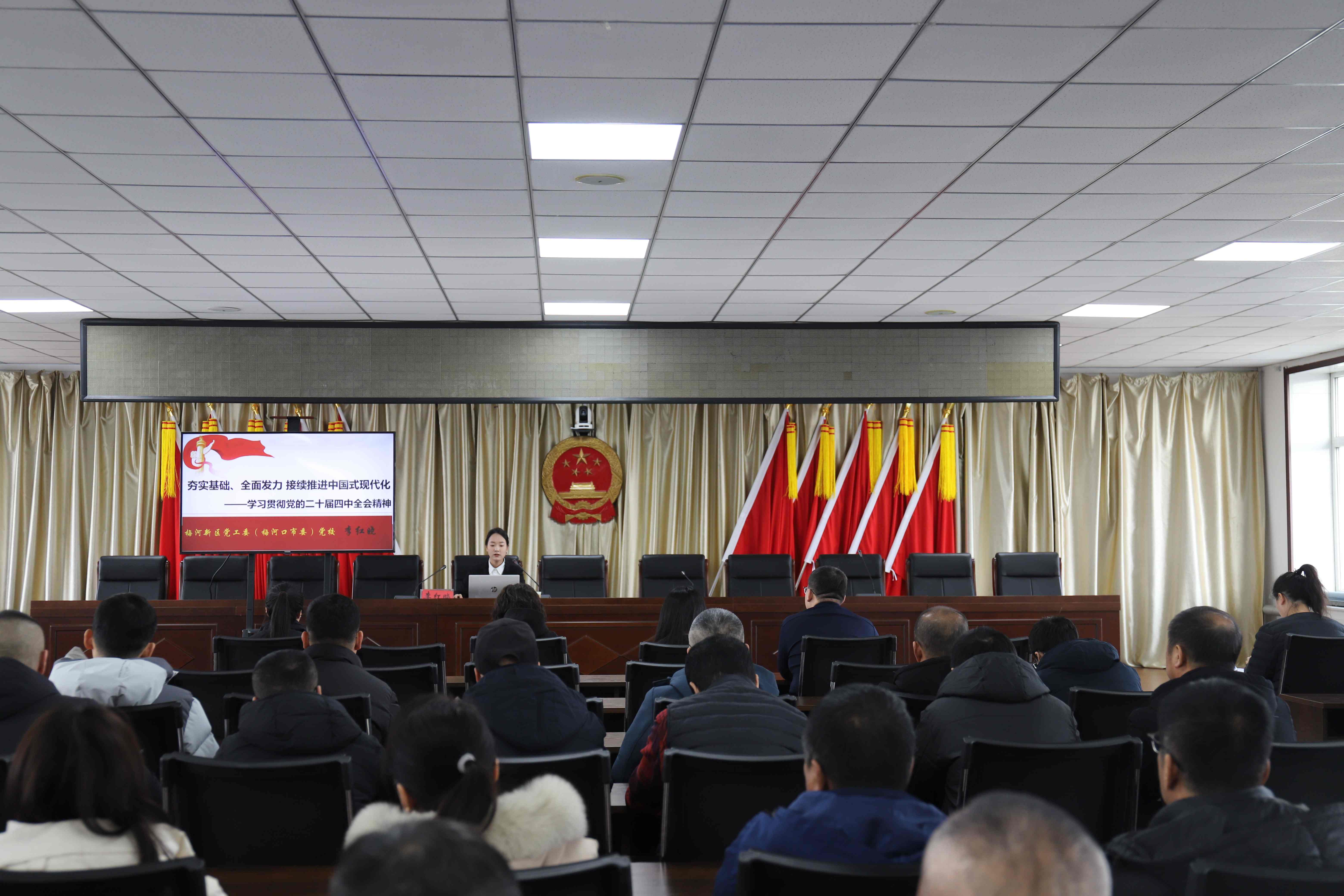 为了深入学习贯彻党的二十届四中全会精神,把思想和行动统一到党中央的决策部署上来,12月4日,新合镇特邀梅河新区党工委(市委)党校李红晓老师,开展学习贯彻党的二十届四中全会精神宣讲会,会议由新合镇党委副书记王珺瑶主持,镇机关干部、各村书记参与。