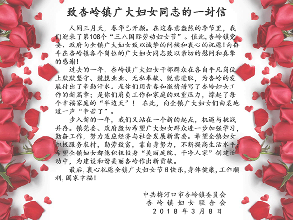 从前,日色变得慢,车马邮件都慢,一生只够爱一个人。今天,杏岭镇妇联以爱之名,为广大妇女同志寄去一笺书信。见字如面,唯有祝愿。