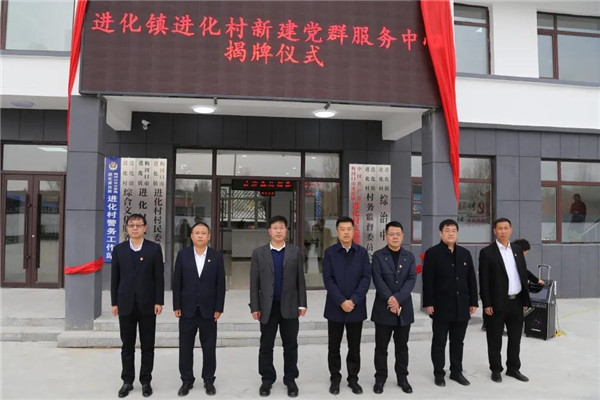 市委常委、政法委书记宁洪友,副市长霍光,进化镇党委书记王陈雷,镇长张宏伟共同为进化村党群服务中心揭牌。