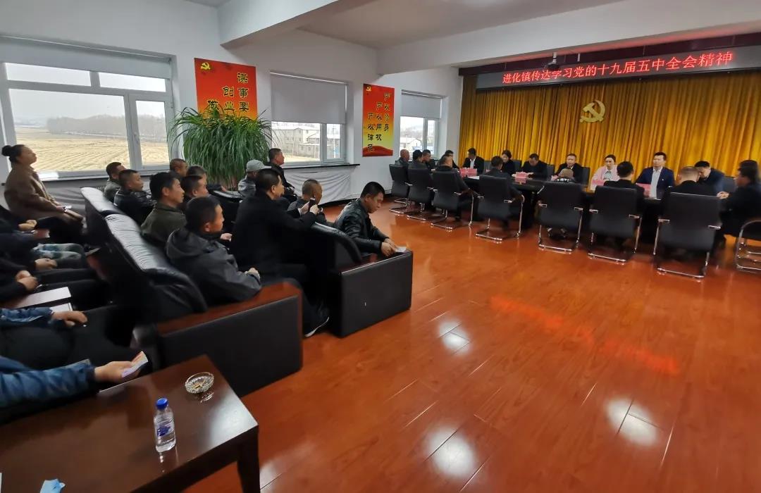 11月12日下午,进化镇召开传达学习党的十九届五中全会精神学习会议,全体机关干部及各村支部书记参加会议。会议要求,全体干部要把思想和行动统一到十九届五中全会精神上来,增强“四个意识”、坚定“两个自信”、做到“两个维护”,要认真梳理好今年的各项工作,紧盯年末打好“十三五”收官之战,并提前谋划2021年工作,确保进化镇实现“十四五”开门红。
