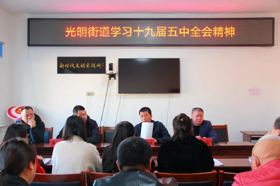 11月13日下午,光明街道召开专题会议,学习传达了党的十九届五中全会精神。会议强调,全街上下要以贯彻学习十九届五中全会为契机,切实抓好当前重点工作,坚持完成全年目标任务不动摇,做好年终各项收尾工作,谋划好2021年重点工作任务,以务实、高效、踏实肯干的精神状态展现光明街道干部职工新担当、新作为。