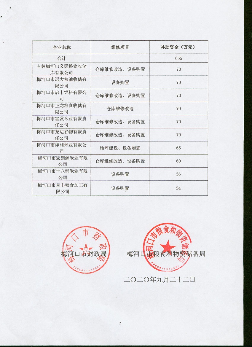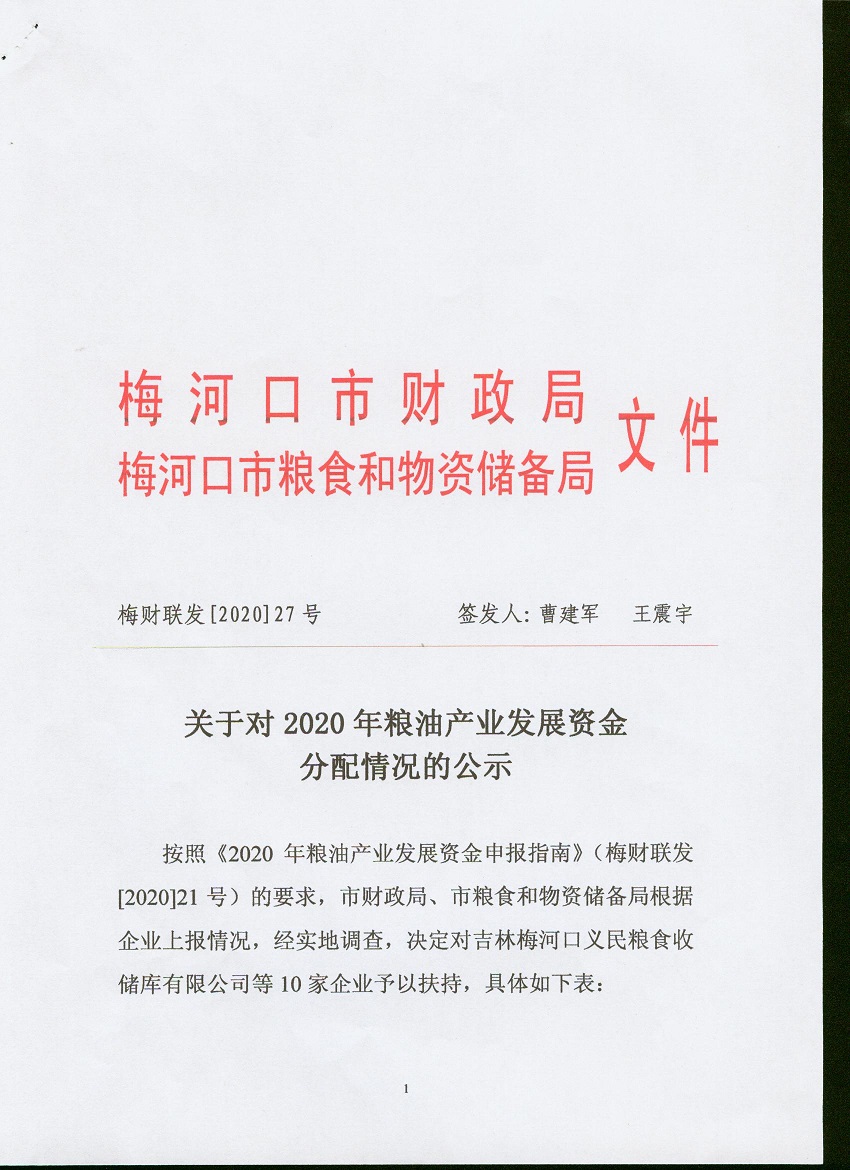 关于对2020年粮油产业发展资金分配情况的公示