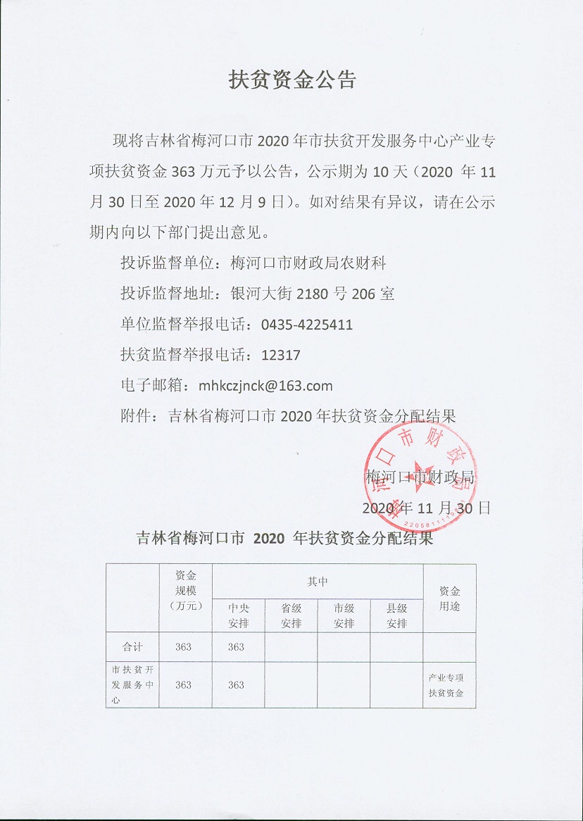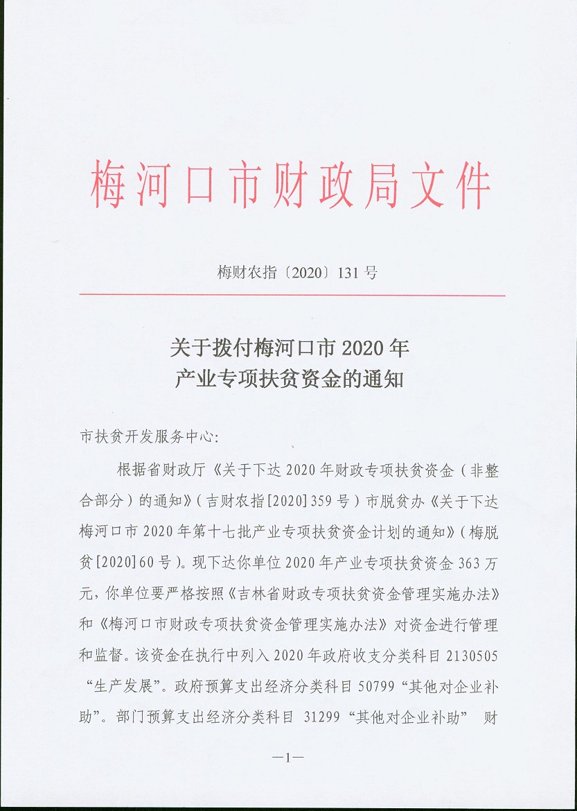 关于拨付梅河口市2020年产业专项扶贫资金的通知梅财农指[2020]131号