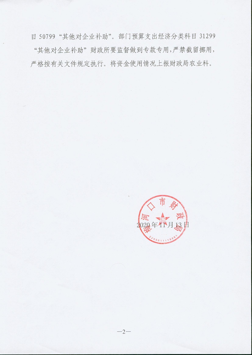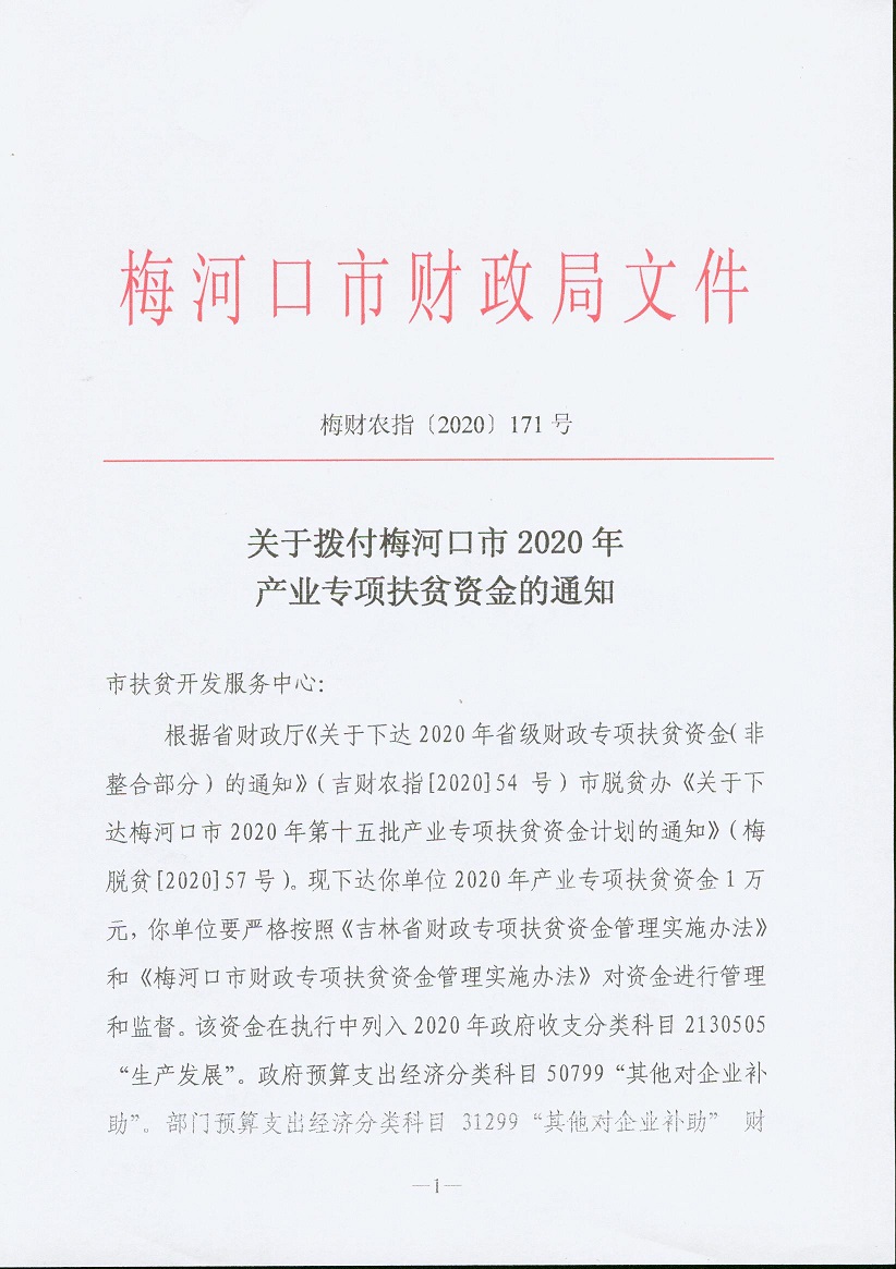 关于拨付梅河口市2020年产业专项扶贫资金的通知梅财农指[2020]171号