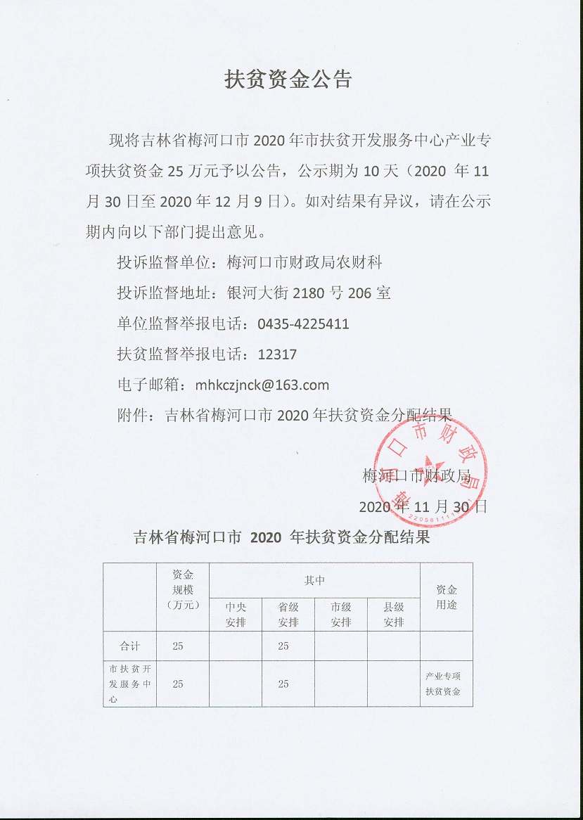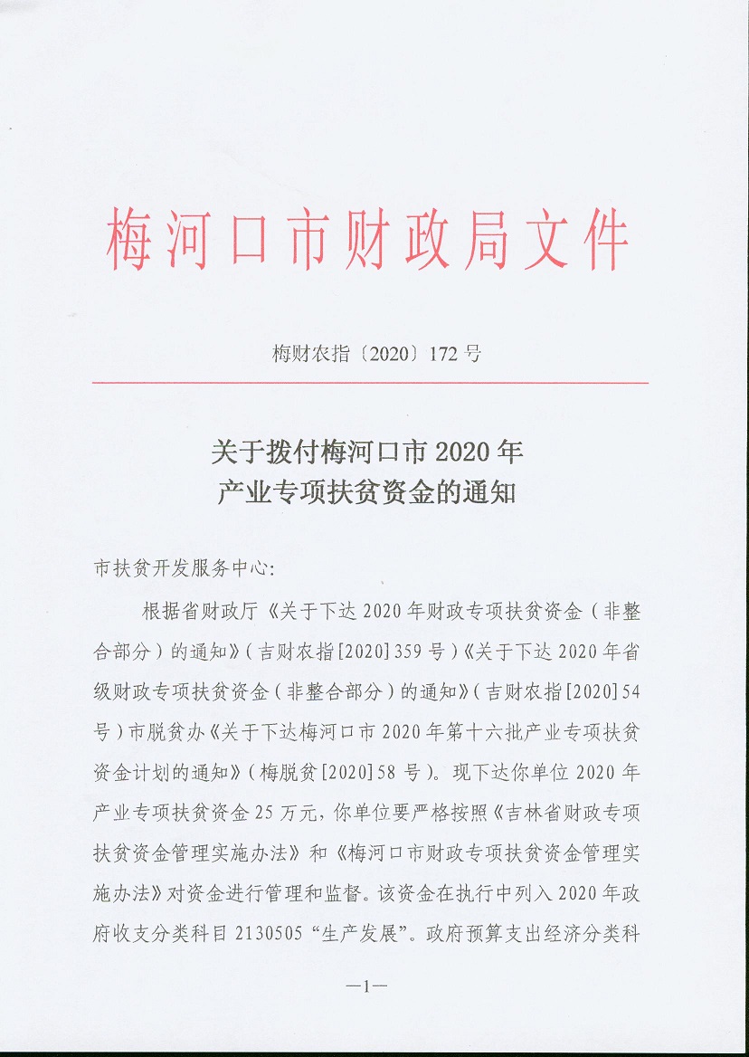 关于拨付梅河口市2020年产业专项扶贫资金的通知梅财农指[2020]172号