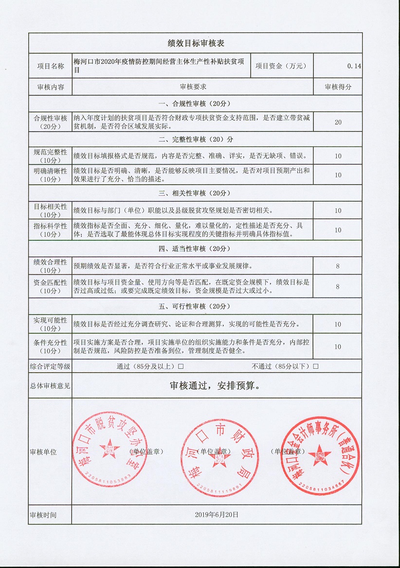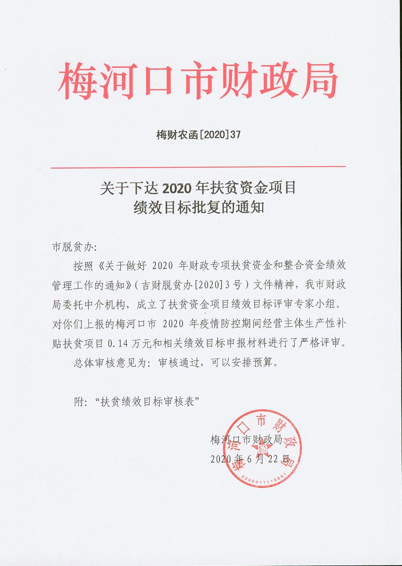 关于下达2020年扶贫资金项目绩效目标批复的通知 梅财农函[2020]37号