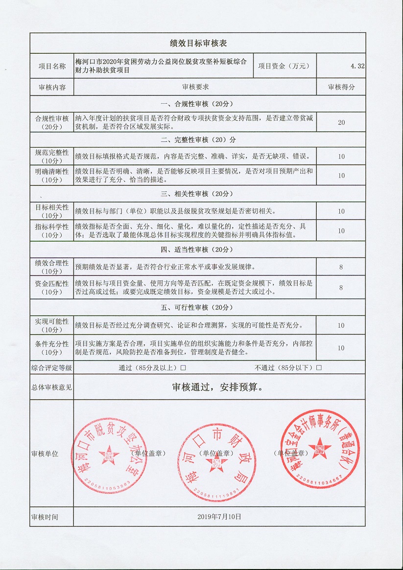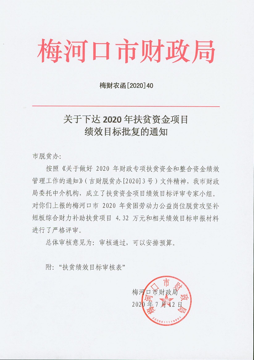 关于下达2020年扶贫资金项目绩效目标批复的通知 梅财农函[2020]40号