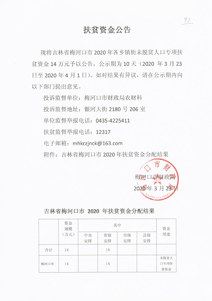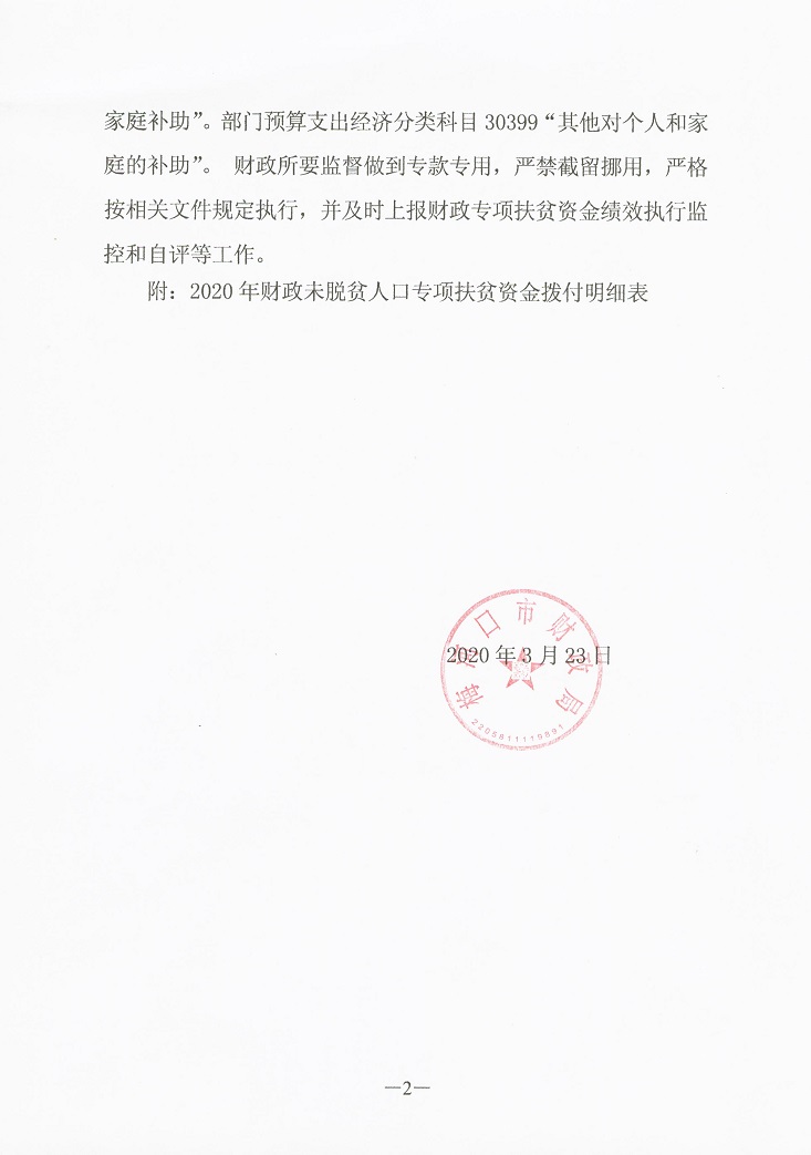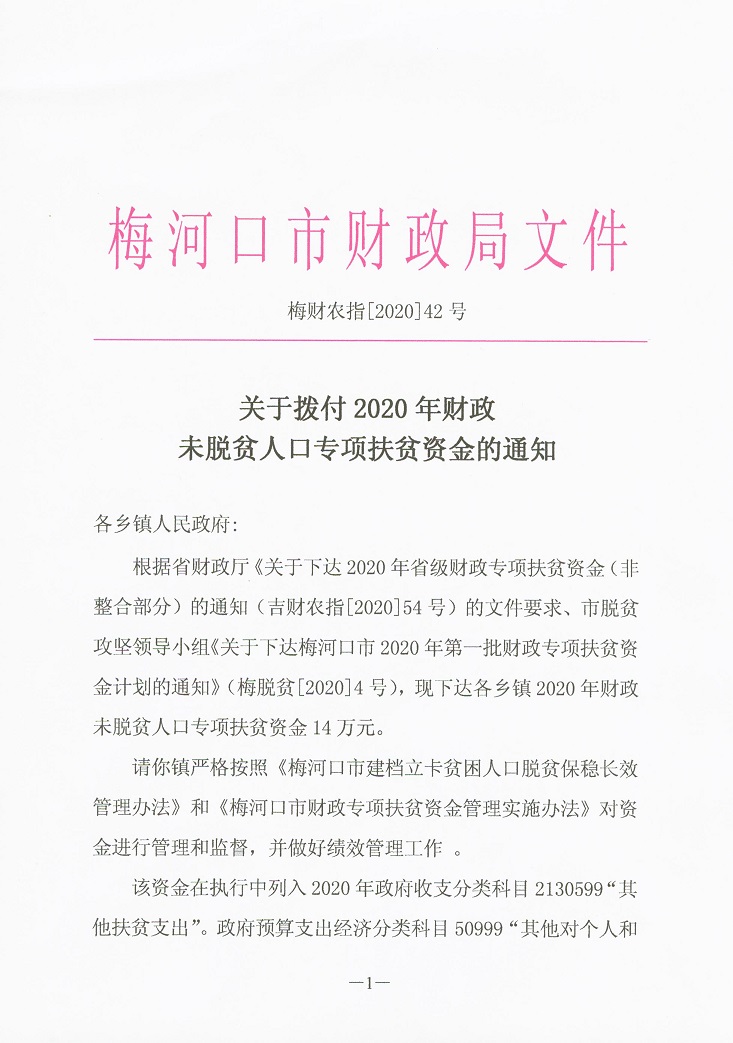 关于拨付2020年财政未脱贫人口专项扶贫资金的通知 梅财农指[2020]42号