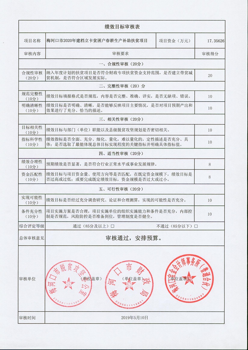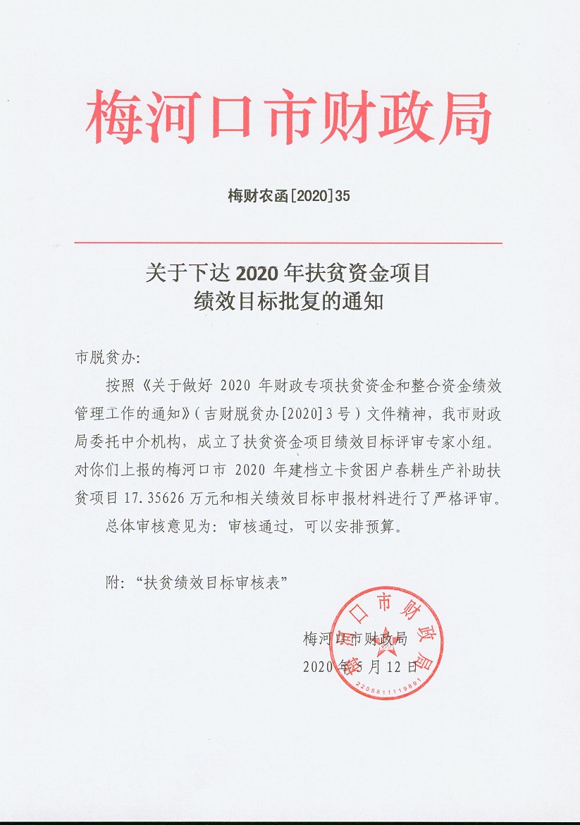 关于下达2020年扶贫资金项目绩效目标批复的通知 梅财农函[2020]35号