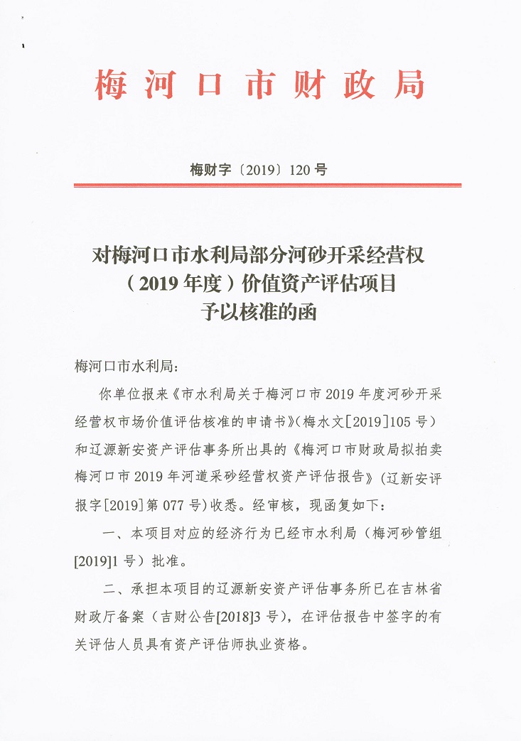 对梅河口市水利局部分河沙开采经营权(2019年度)价值资产评估项目予以核准的函