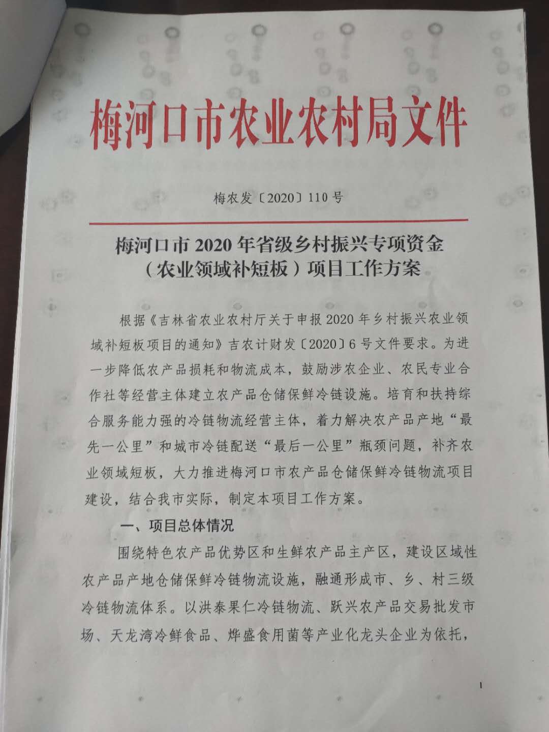 梅河口市2020年省级乡村振兴专项资金(农业领域补短板)项目工作方案