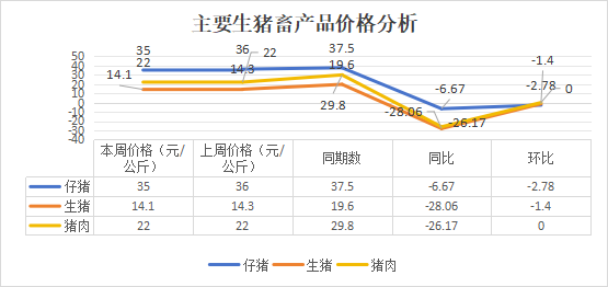 本周仔猪价格35元/公斤,上周价格36元/公斤,同比下降6.67%,环比下降2.78%;生猪价格14.1元/公斤,上周价格14.3元/公斤,同比下降28.06%,环比下降1.4%;猪肉价格22元/公斤与上周价格持平,同比下降26.17%,环比持平。