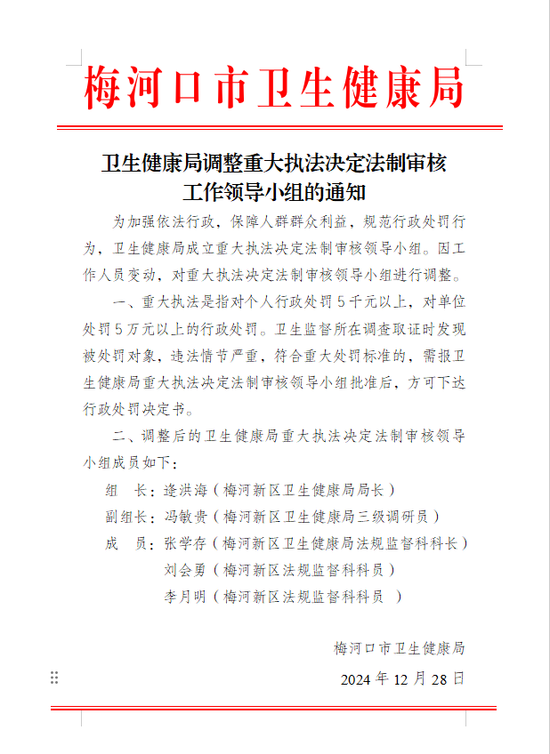 卫生健康局调整重大执法决定法制审核工作领导小组的通知