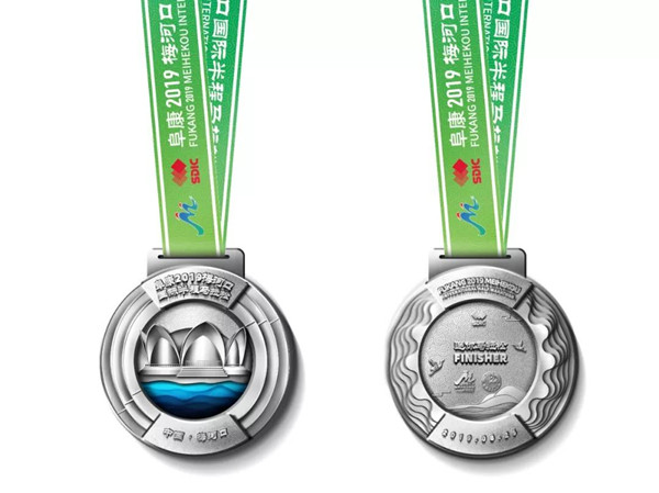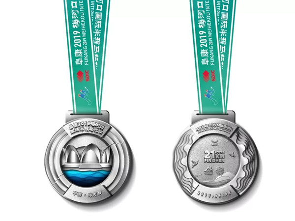 梅河口因境内辉发河汇入大柳河的河口处而得名,因此奖牌设计理念上也在奖牌底部填入蓝色玻璃漆,利用不同的层高设计,让玻璃漆显现渐变效果,表现梅河口无限苍穹和优美的自然环境。背奖牌背面以水波纹曲线做高低层高设计,丰富层次感。并以山水点缀,突显梅河口山清水秀,风光旖旎的美好。苍穹之下,天地相容。