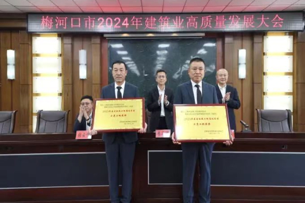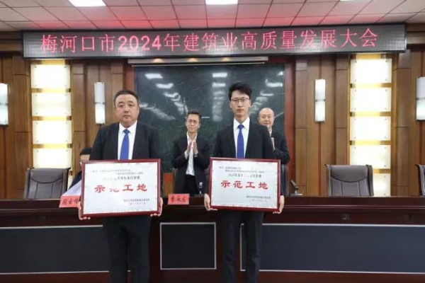 会上为获得2023年度“省级、市级标准化管理示范工地”的梅河口市2022年保障性租赁住房项目(A、B标段)的施工单位颁发了奖牌。