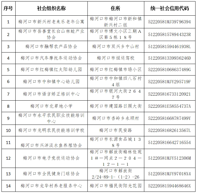 根据《社会团体登记管理条例》、《民办非企业单位登记管理暂行条例》和“梅河口市民政局《行政处罚决定书》送达公告(梅民行告字〔2025〕第3、4号)”,我局决定在“中国社会组织政务管理平台”上对14个社会组织(名单见附件)进行撤销,现予以公告。