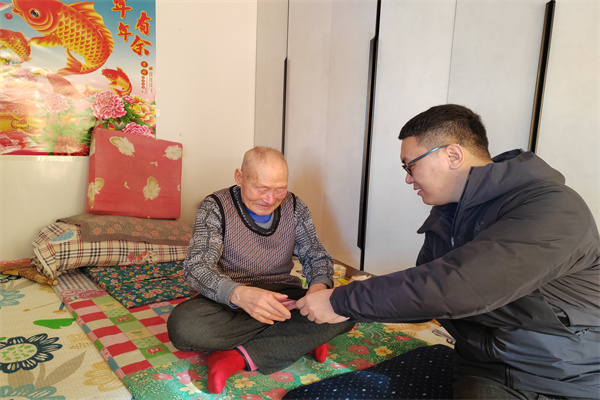 “大爷,新春快乐!我们来看您了。”走进张义成家中,孙伟男第一时间握住老人的手,将慰问金递到他手中,关切询问身体状况和冬季生活保障情况。97岁的张义成老人笑容满面,连连致谢:“感谢党和政府一直惦记着我们,心里特别温暖。”工作人员叮嘱家属悉心照料,有困难及时联系服务站。