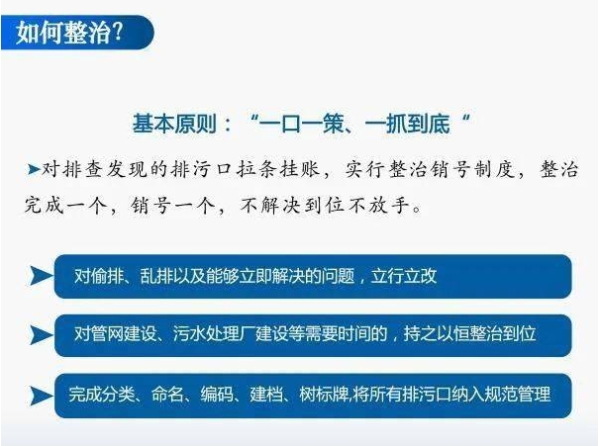 实施分类整治。将排污口分为工业排污口、污水处理厂排污口、雨洪排口、农业排口、其他排口等。坚持“问题导向,一口一策、分类施策、属地管理”整治基本原则。依法取缔一批、清理合并一批、规范整治一批,建立逐级审核和销号制度,最终形成需要保留的排污口清单。