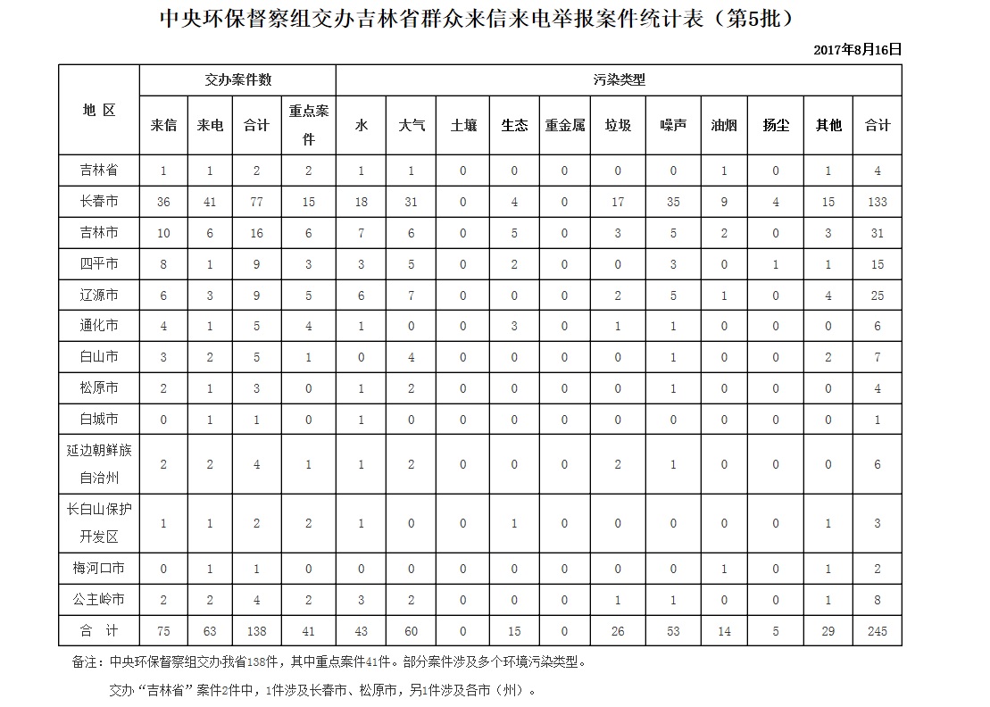8月16日14:30,我省接到中央环保督察组交办的第五批案件,共计138件。其中,重点案件41件。长春市77件(重点案件15件)、吉林市16件(重点案件6件)、四平市9件(重点案件3件)、辽源市9件(重点案件5件)、通化市5件(重点案件4件)、白山市5件(重点案件1件)、松原市3件、白城市1件、延边州4件(重点案件1件)、长白山保护开发区2件(重点案件2件)、梅河口市1件、公主岭市4件(重点案件2件)。另有直接交办我省案件2件(重点案件2件),其中1件涉及长春市、松原市,1件涉及各市(州)。
